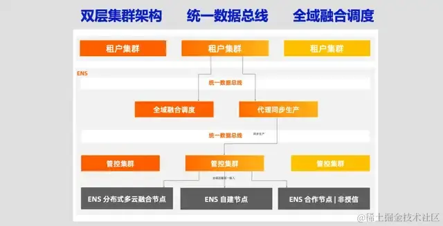 在此基础之上,最上层提供给用户的租户集群是用户可见的集群,每一个租户集群可以实际使用的底层资源其实是刚才提到全球所有的边缘节点,每个用户可以看到的也是这么多个节点,用户可以在租户集群里面提出一些具体的部署需求。比如说我想要在全球范围内部署多少个副本,要调度到全球范围内不同的城市,提出这些资源部署需求之后,通过中间全域融合调度还有同步生产的体系,就可以把这些真实用户的应用分布到底层实际的全球各地的节点上面去。