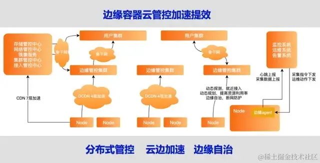 其实边缘Node网络环境是最未知的,它可能是一些国内外小运营商等等,它和边缘管控集群之间的网络我们也通过自家的产品做了一个四层的动态加速,保证这个集群和Node之间的通信是通畅的。和别的一些中心提供的基础的服务之间我们也是全域都走了自家的CDN进行加速,保证边缘和中心的管控之间通信是非常流畅的。