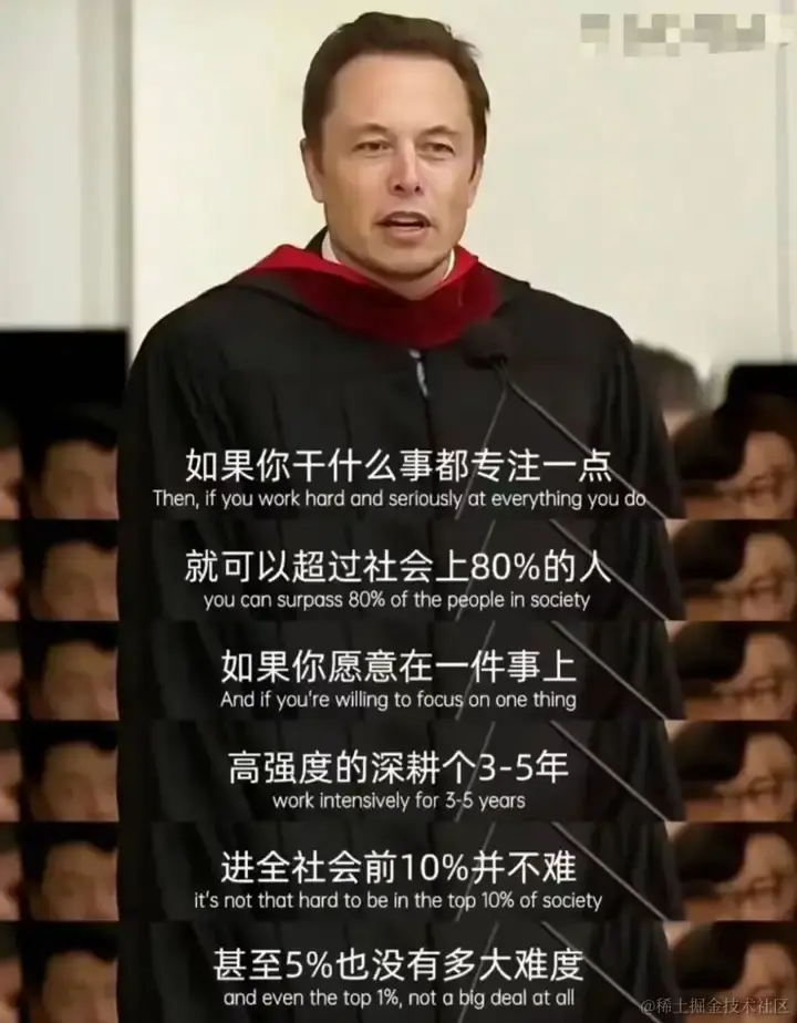 在这个过程中,你会发现如果不用设计模式与算法,那么很多需求的实现会变的非常难以实现。不停的重构,是每个开发者的宿命。自然在千锤百炼之后,你也会朝着一个技术专家之路迈进。自然,千里之行始于足下,同时万事也是开头难。最后送大家马斯克的一段话,共勉!