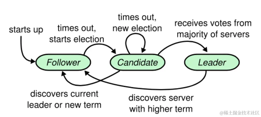 第三种状态,候选人,是用来选举新领导人时使用。下图展示了这些状态和他们之间的转换关系: