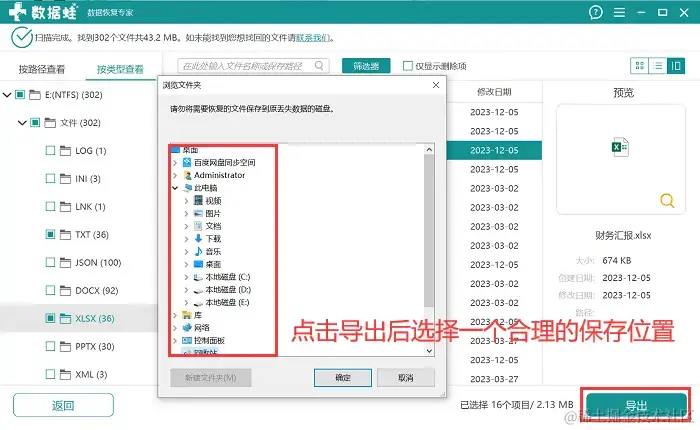 第3步:检查要恢复的文件都勾选完毕后,点击【导出】,并为文件选择一个合理的保存位置,将文件都保存好后,可以进行查看。