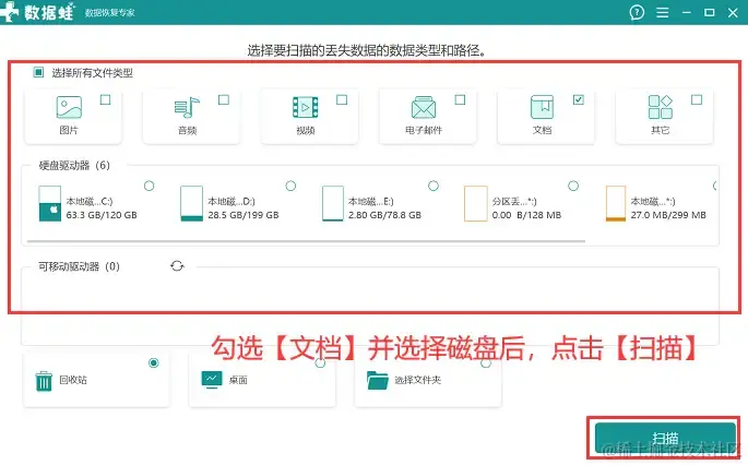第1步:正确将软件安装到电脑上,双击运行它后,恢复Excel文件的用户可以只勾选【文档】 ,并勾选相关的文件夹或者磁盘,点击执行 【扫描】 操作;