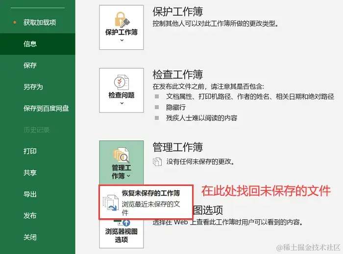 第2步:选择【信息】,找到 【管理工作簿】部分;