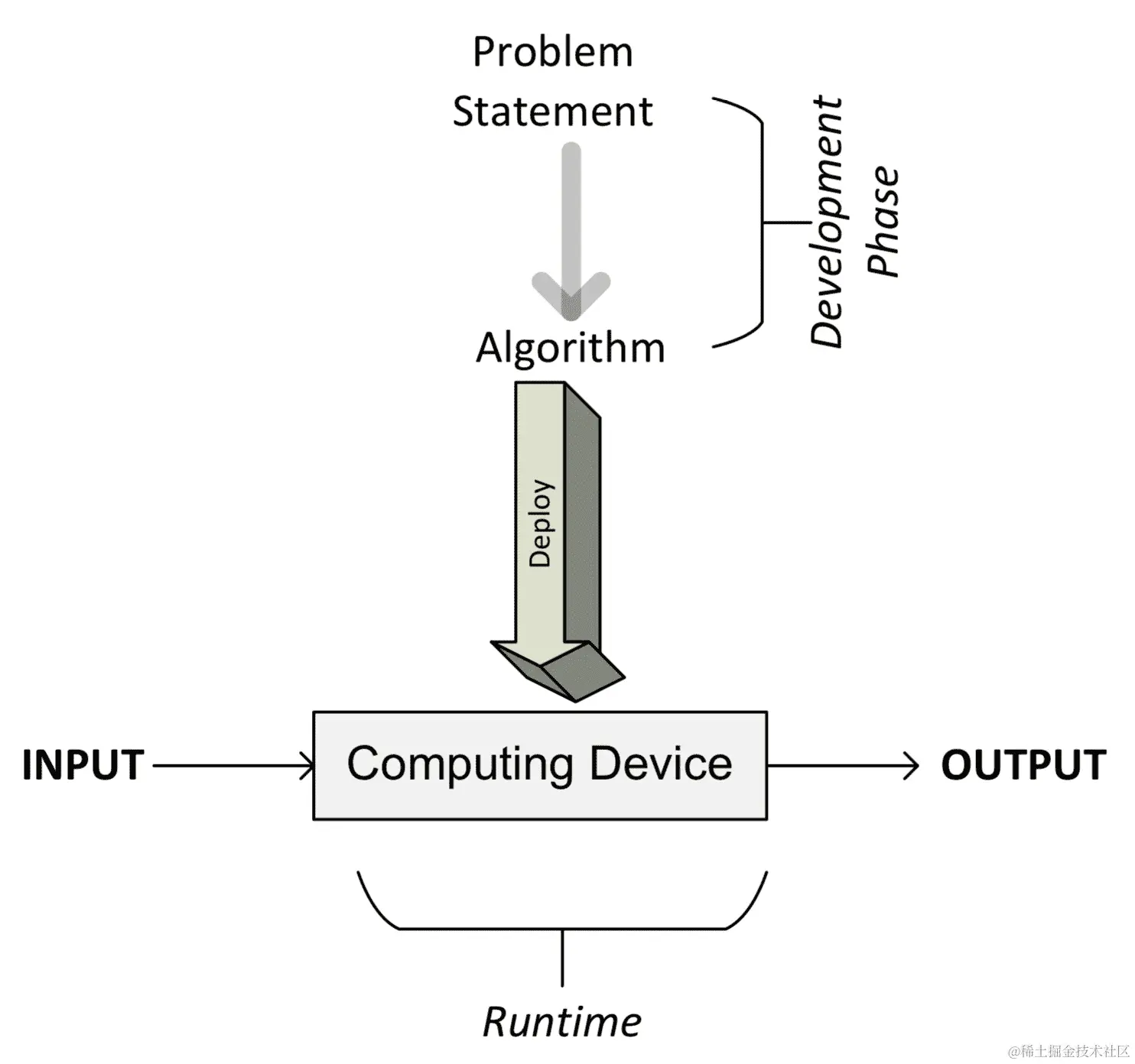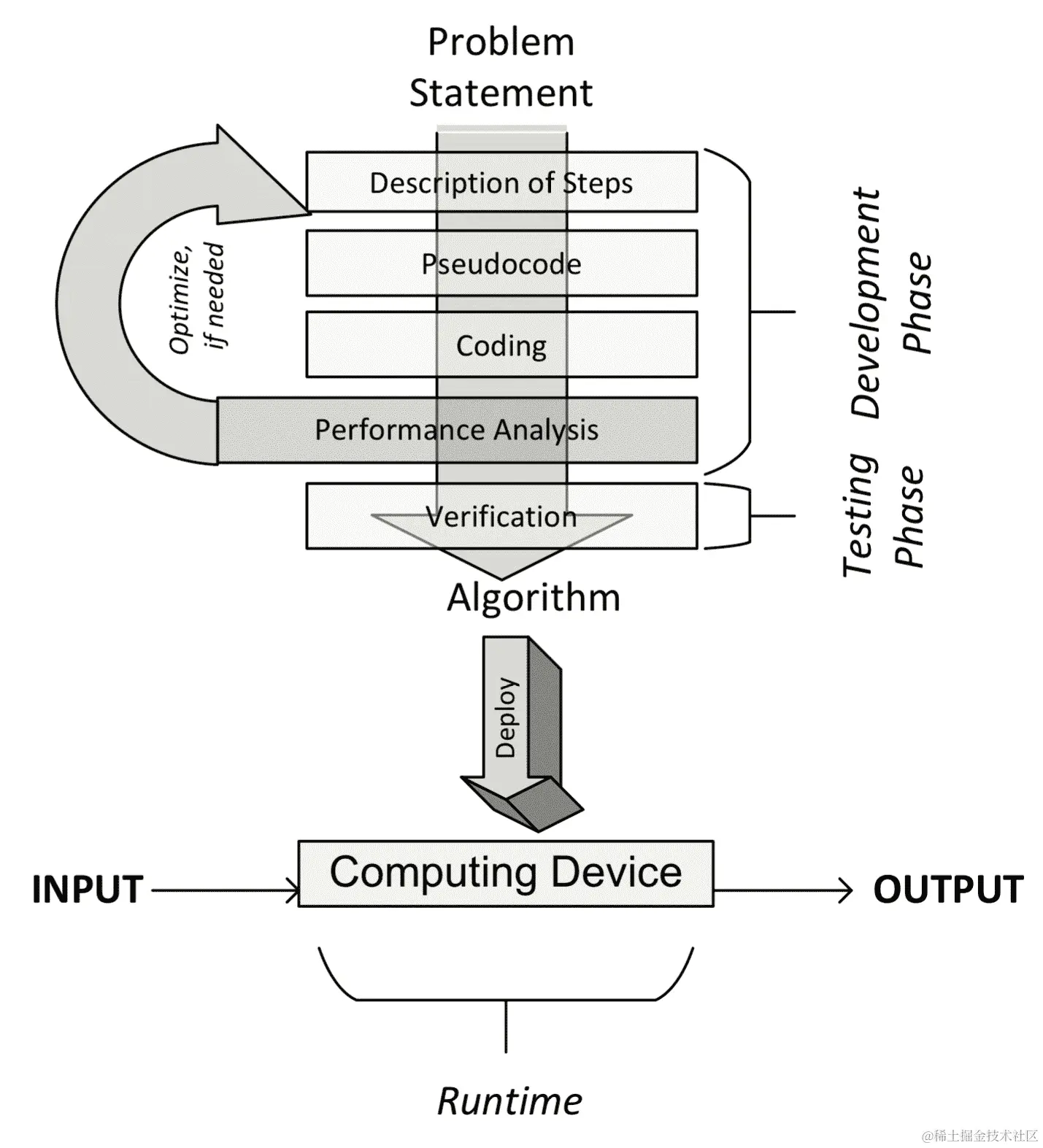 以下图表说明了开发、部署和最终使用算法的不同阶段: