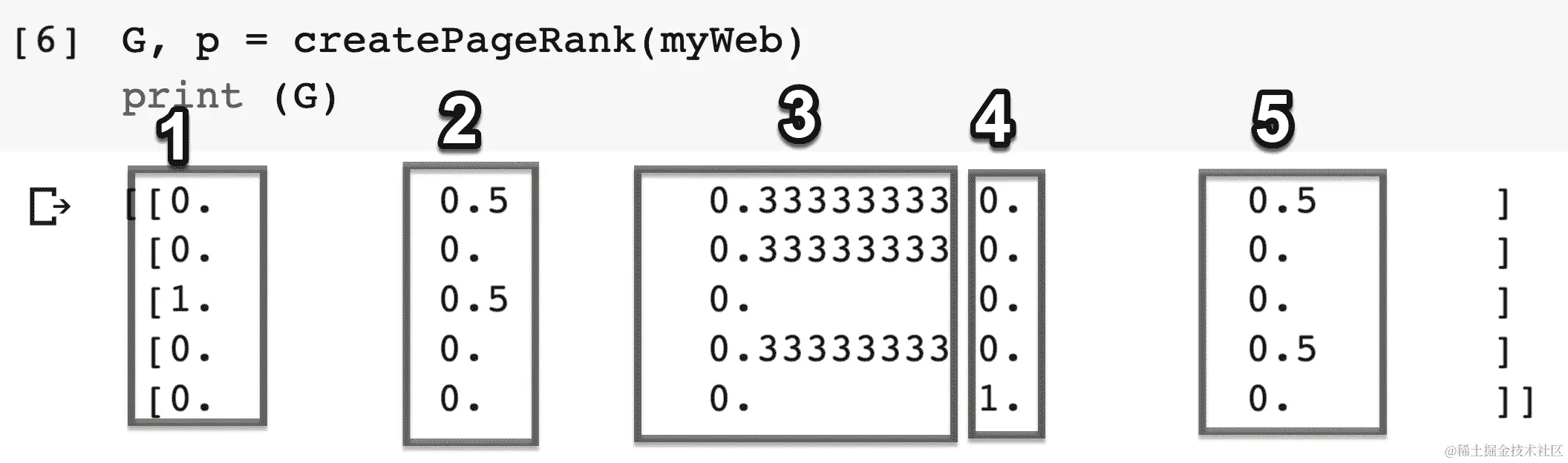 在 PageRank 算法中,网页的模式包含在一个称为转换矩阵的矩阵中。有一些算法不断更新转换矩阵,以捕捉不断变化的网络状态。转换矩阵的大小是n x n,其中n是节点的数量。矩阵中的数字是访问者由于出站链接而下一个转到该链接的概率。