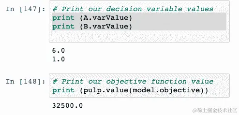 然后,我们打印A和B的值以及目标函数的值: