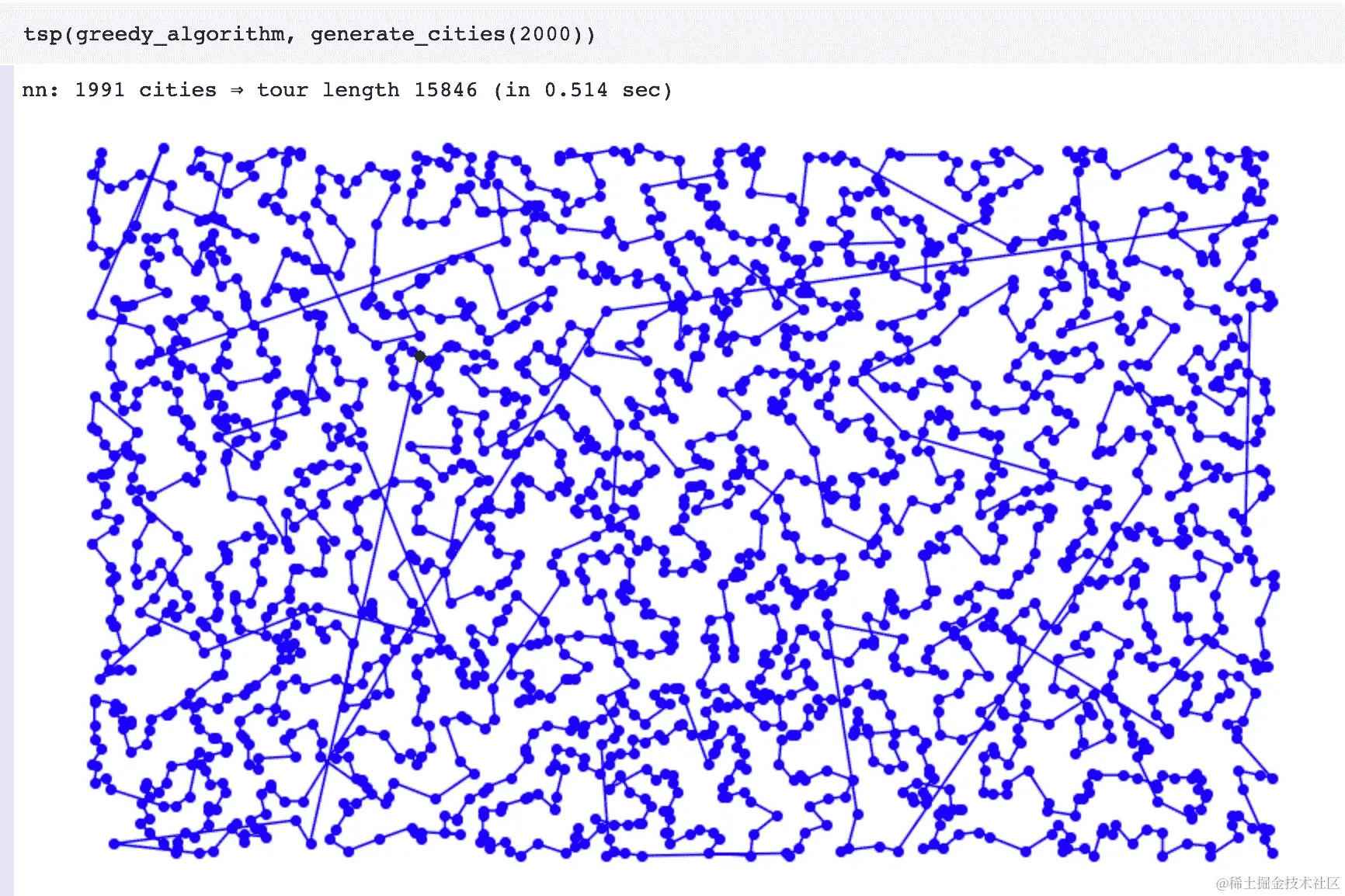 请注意,生成 2,000 个城市的旅游路线只花了 0.514 秒。如果我们使用了暴力方法,它将生成*(2000-1)!*个排列,几乎是无穷大。