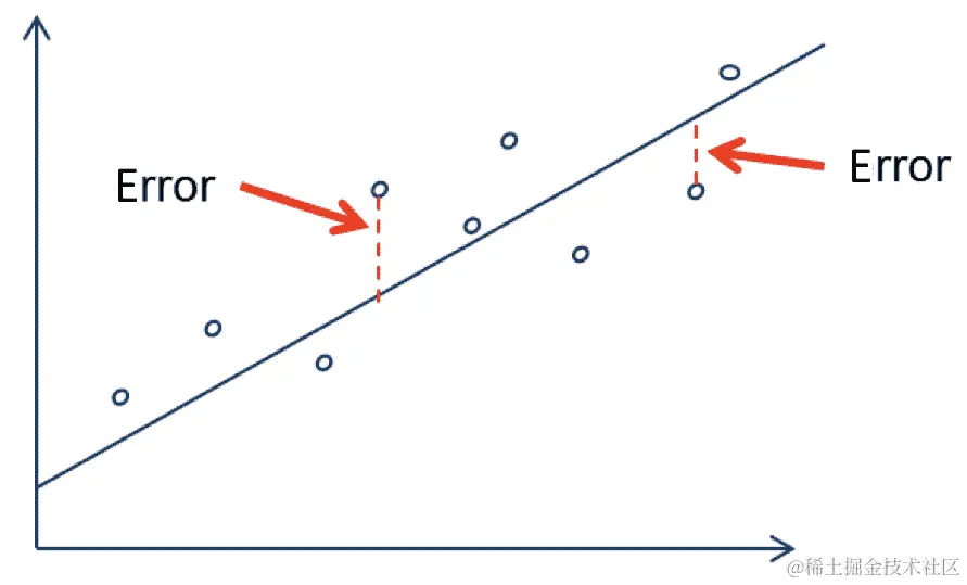 我们画的线性线是因变量和自变量之间关系的近似值。即使最佳线也会与实际值有一些偏差,如下所示: