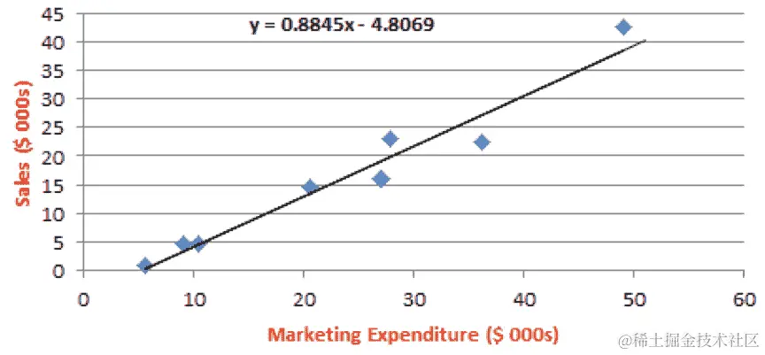 让我们看一个具体的例子。让我们尝试阐明特定产品的营销支出和销售之间的关系。它们被发现直接相关。营销支出和销售在二维图上绘制,并显示为蓝色的钻石。这种关系最好通过绘制一条直线来近似,如下图所示: