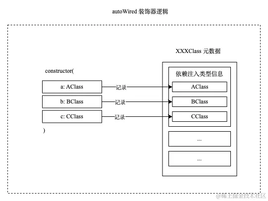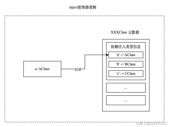 从前面了解到的装饰器和反射的知识可以知道,当装饰器写在类申明前,其实是获取的信息是类的构造函数的信息。所以可以在装饰器的逻辑内获取到构造函数的参数列表的元数据,这就好办了。