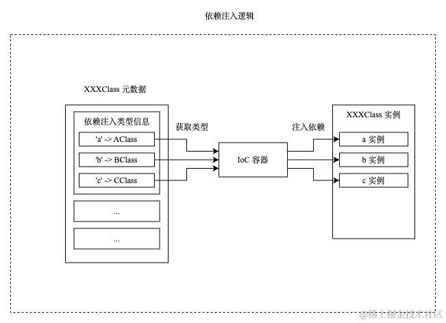 在使用依赖注入的框架里,都会有一个 IoC 容器,它的职责就是帮忙管理类的依赖关系,负责类的实例化,以及类的依赖注入。我们通过一个简单的伪代码来了解下 IoC 容器都做了什么?