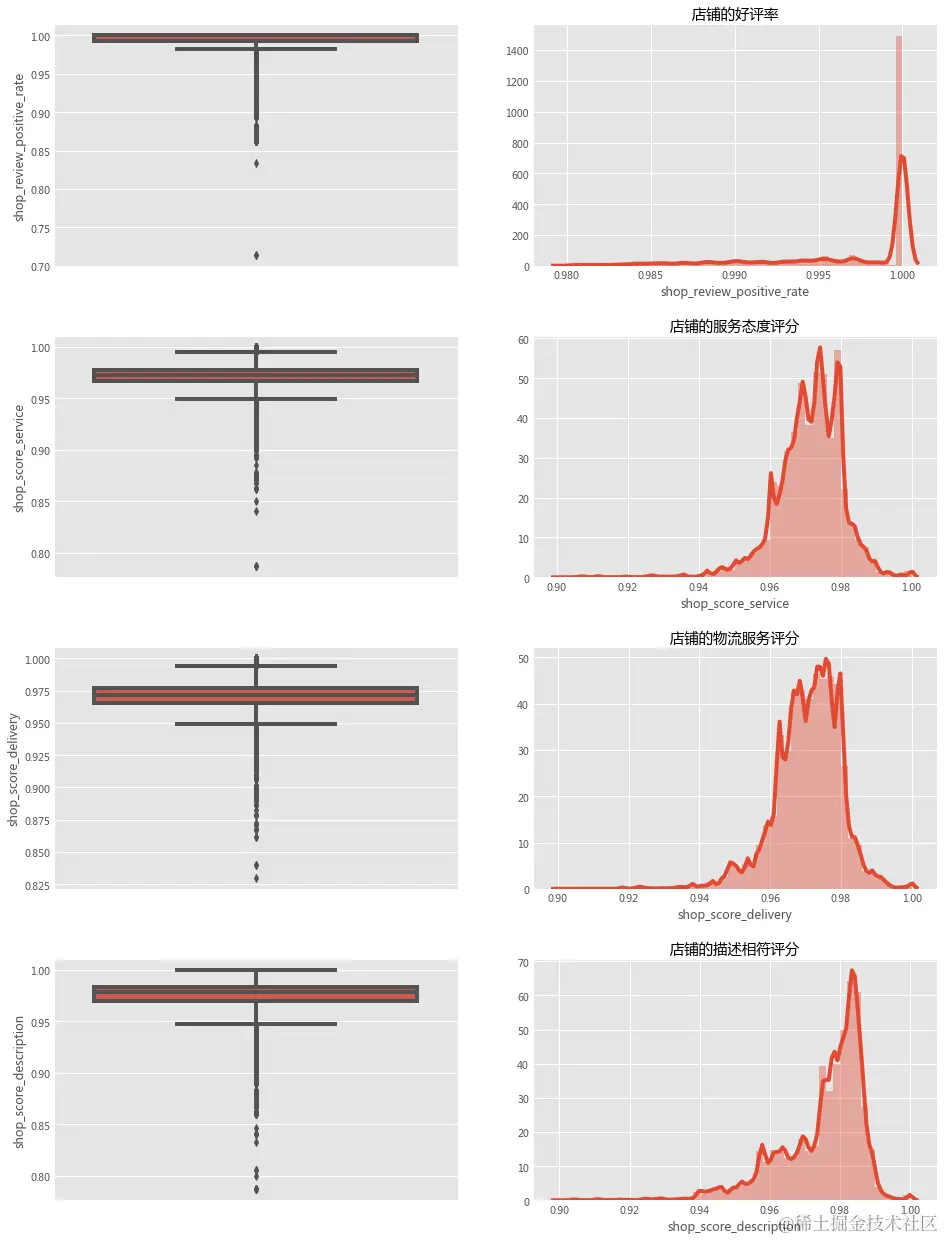 0.98,在0.850.90之间出现一系列离群点,最小值为0.787 - 店铺物流评分与服务评分分布分布在0.96~0.95,最小值为0.92