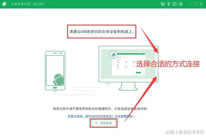 步骤一:下载并安装完【数据蛙安卓恢复专家】后,确保电脑和手机处于同一局域网下,有USB连接和无线连接两种方法,可选择合适的方法将手机连接到电脑。
