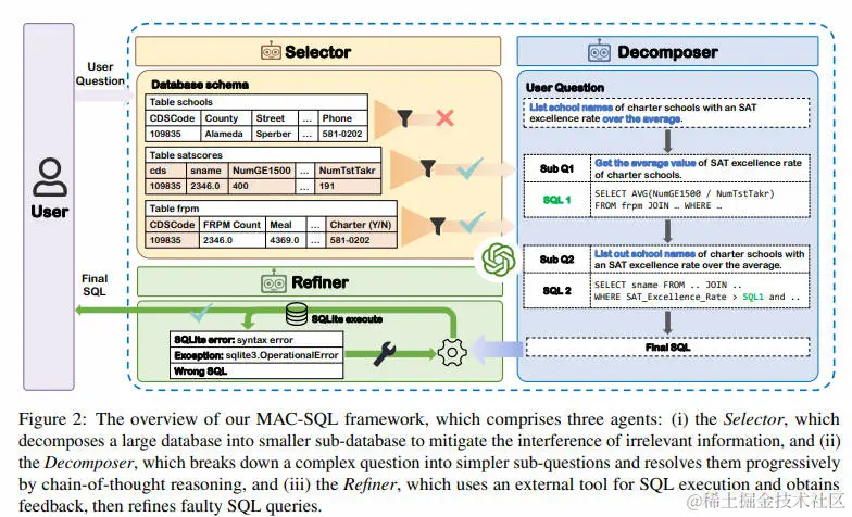 在的框架中,首先使用任务强大骨干LLM来确定框架上限。然后,通过利用Code Llama 7B微调开源指令跟随模型SQL-Llama来显示,在BIRD基准测试中,SQL-Llama达到43.94%执行准则为46.35% 的基线准确率相当接近 。撰写本文时, MAC-SQL+GPT-4 在holdout测试集上取得59.59% 的执行准确率, 创造了一个新水平(SOTA)。