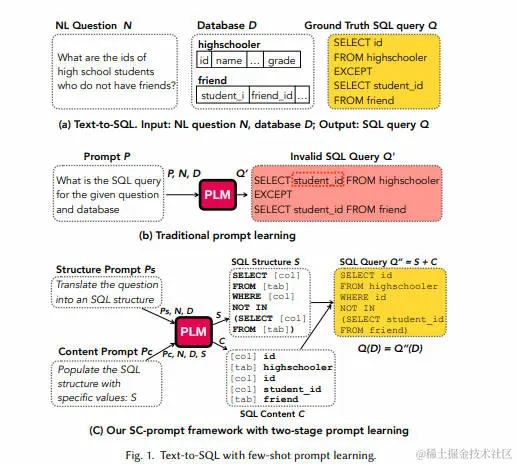 此外,还设计了关键词约束解码来确保生成的SQL结构的有效性,以及结构引导解码来确保模型填充正确的内容。通过与撰写本文时最新的十个Text-to-SQL解决方案进行广泛比较,实验结果表明,SC-Prompt在少样本场景下显著优于它们。特别是在广泛采用的Spider数据集上,给定少于500个标记的训练样本(官方训练集的5%),SC-Prompt在准确率上比之前的最佳方法高出约5%。