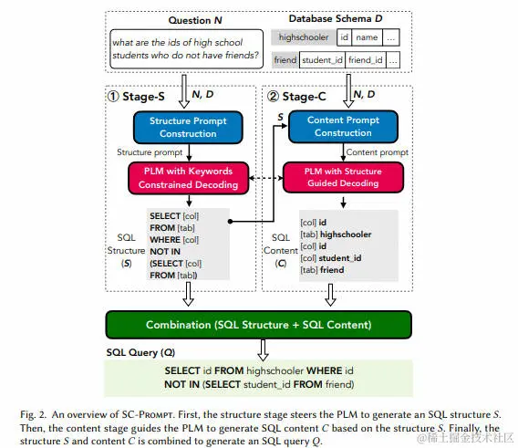 第一阶段,称之为结构阶段,它引导PLM生成一个带有占位符的SQL结构(包括SQL命令,如SELECT、FROM、WHERE,以及SQL运算符,如“<”、“>”)。这些占位符用于缺失的标识符。
