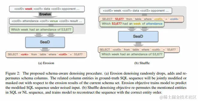 在文本到SQL(text-to-SQL)任务中,由于架构的限制,序列到序列(seq-to-seq)模型往往导致次优性能。本文提出了一种简单而有效的方法,将基于Transformer的seq-to-seq模型适配为健壮的文本到SQL生成器。并没有对解码器施加约束或将任务重新格式化为槽填充,而是提出了使用Schema感知去噪(Schema-aware Denoising,SeaD)来训练seq-to-seq模型。SeaD包含两个去噪目标,分别训练模型从两种新颖的去噪方法——侵蚀和洗牌中恢复输入或预测输出。这些去噪目标作为辅助任务,有助于更好地在序列到序列(S2S)生成中建模结构化数据。此外,改进并提出了一个子句敏感的执行引导(Execution Guided,EG)解码策略,以克服生成模型中EG解码的局限性。实验表明,所提出的方法在模式链接和语法正确性方面提高了seq-to-seq模型的性能,并在WikiSQL基准测试上建立了新的先进水平。这些结果表明,文本到SQL中基于Transformer的seq-to-seq架构的潜力可能被低估了。