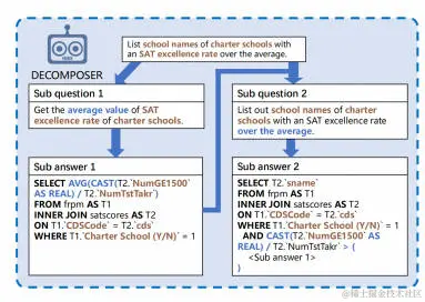 研究了将复杂的文本到SQL任务分解为更小子任务的问题,以及这种分解如何显著提高大型语言模型(LLMs)在推理过程中的性能。目前,在诸如Spider等具有挑战性的文本到SQL数据集上,使用LLMs的微调模型与提示方法之间的性能存在显著差距。展示了可以将SQL查询的生成分解为子问题,并将这些子问题的解决方案输入到LLMs中,以显著提高其性能。对三个LLMs进行的实验表明,这种方法能够一致地将其简单的几次尝试性能提升约10%,使LLMs的准确率接近或超过当前最佳水平。在Spider的保留测试集上,以执行准确率为标准,当前最佳水平为79.9,而使用该方法实现的新最佳水平为85.3。的基于上下文学习的方法至少比许多经过大量微调的模型高出5%。