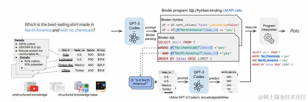 尽管端到端的神经方法最近在NLP任务中在性能和易用性方面占据主导地位,但它们缺乏可解释性和鲁棒性。提出了BINDER,一个无需训练的神经符号框架,它将任务输入映射到程序,从而实现以下功能:(1)将语言模型(LM)功能的统一API绑定到编程语言(如SQL、Python),从而扩展其语法覆盖范围,解决更多样化的问题;(2)将LM既用作程序解析器,又用作执行期间API调用的底层模型;(3)仅需要少量上下文示例注释。具体而言,采用GPT-3 Codex作为LM。在解析阶段,仅需少量上下文示例,Codex就能够识别任务输入中无法由原始编程语言回答的部分,正确生成API调用来提示Codex解决无法回答的部分,并在保持与原始语法兼容的同时确定API调用的位置。在执行阶段,Codex可以在API调用中提供适当的提示,执行多种功能(如常识问答、信息提取)。BINDER在WIKITABLEQUESTIONS和TABFACT数据集上实现了最先进的结果,并提供了明确的输出程序,有助于人类调试。请注意,之前的最佳系统都需要在数万个特定于任务的样本上进行微调,而BINDER仅使用几十个作为上下文示例的注释,无需任何训练。