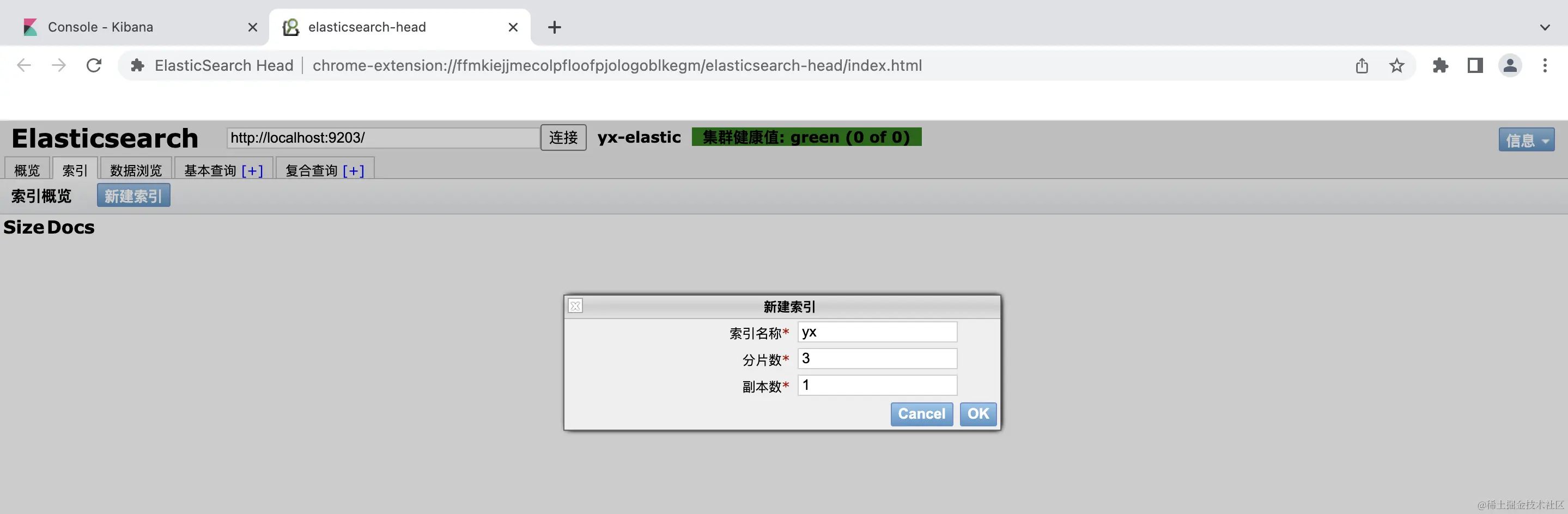 4.重新通过elasticsearch-head工具在控制台点击【索引】选项进行新建索引的测试。
