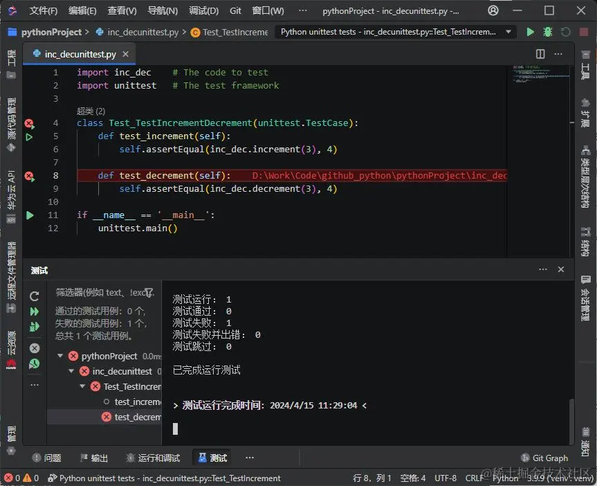 Python扩展支持使用 unittest 和 pytest 框架进行测试。CodeArts 可以帮助您配置框架集成,并提供专用的“测试”视图,让您能够方便地识别和运行测试。 以下是一个如何创建和运行一个 unittest 测试的示例。