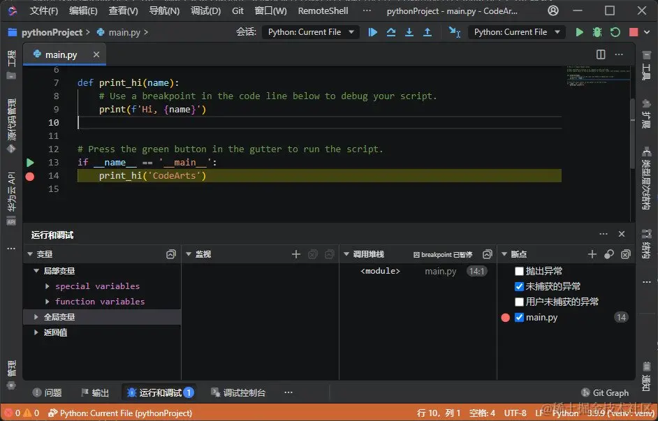 - 对于快速开始项目,您可以在 "main.py" 文件的第 14 行设置一个断点。将光标悬置在 “print_hi” 调用上,然后按下 “F9” / “Ctrl+Shift+B” / “Ctrl+F8”(IDEA快捷键)。您也可以通过单击编辑器左侧的行号旁的空白区域来设置断点。