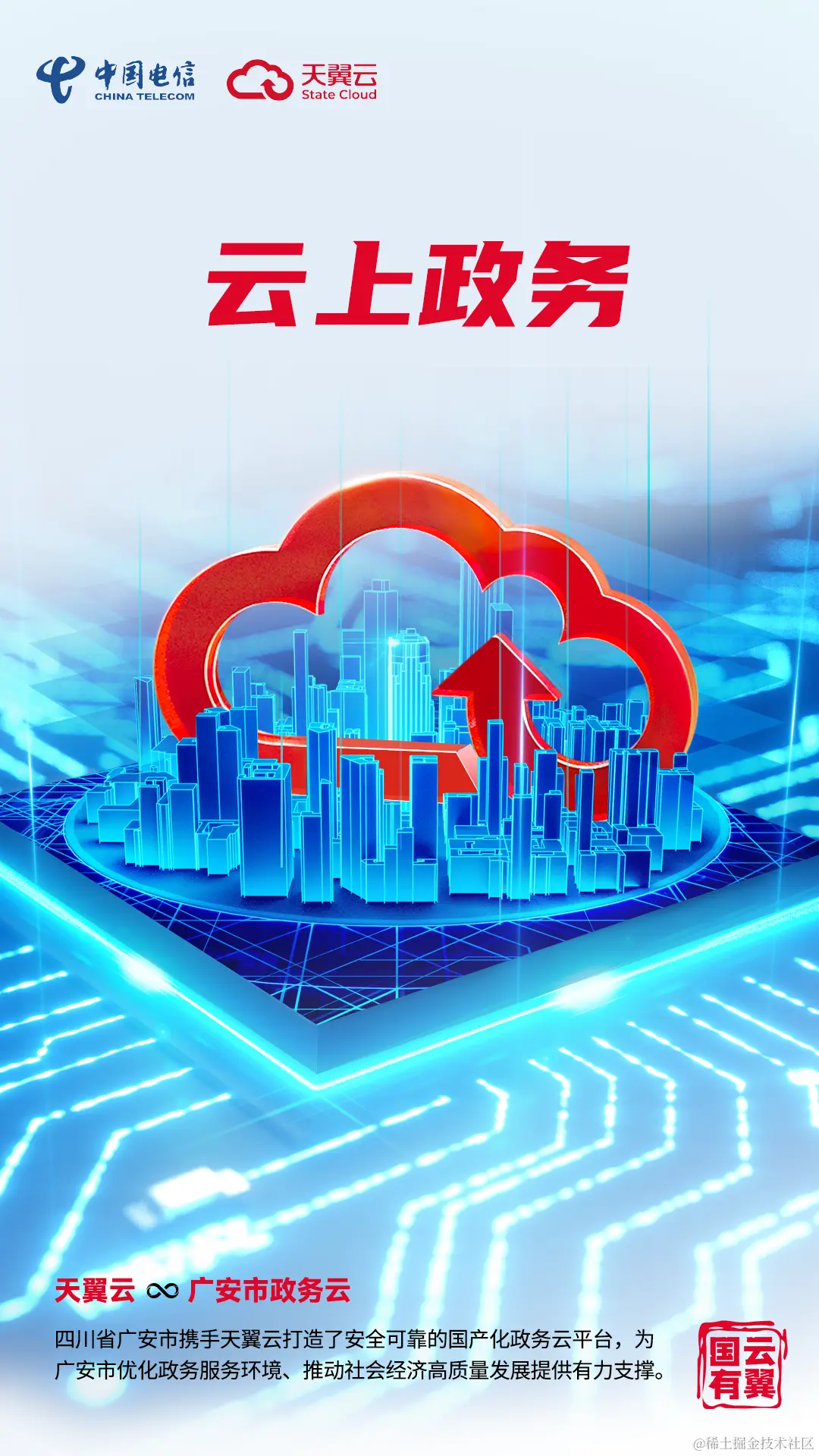 在此背景下,四川省广安市积极开启政务国产化进程,不断提升自身履职能力与政务服务能力。通过携手天翼云,广安市打造了安全可靠的国产化政务云平台,为广安市提高政府治理水平、推动社会经济高质量发展提供有力支撑。