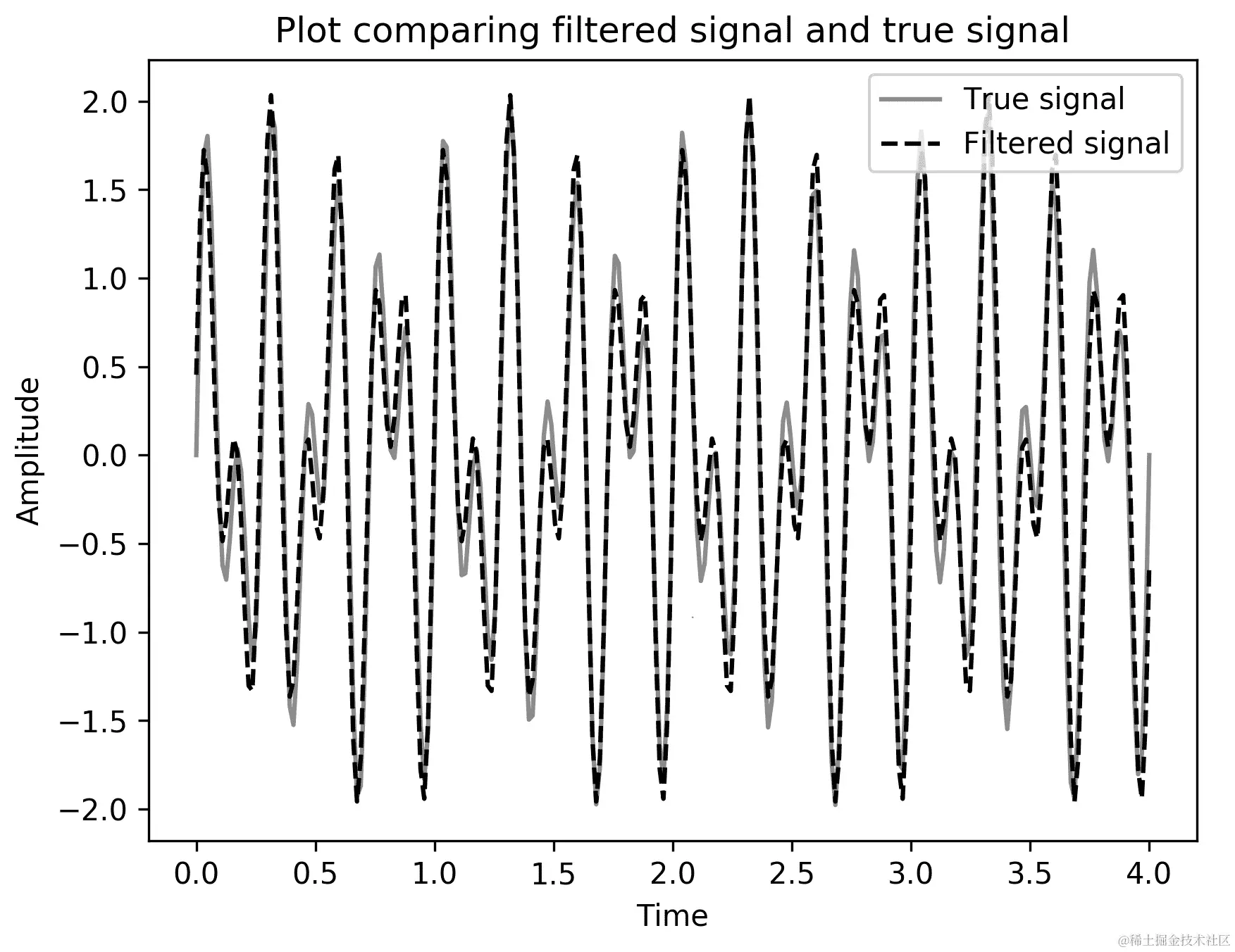 - 最后,我们绘制这个滤波信号和真实信号进行比较: