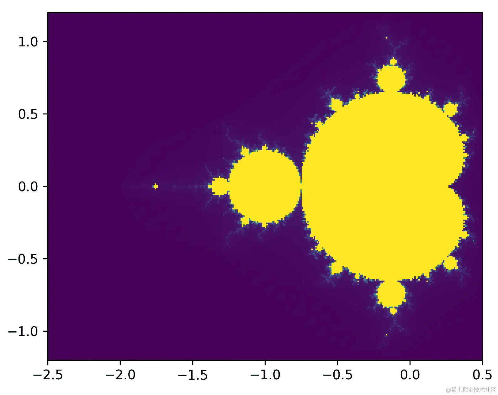 - 最后,绘制 Cython 版本的输出,以检查例程是否正确计算了 Mandelbrot 集: