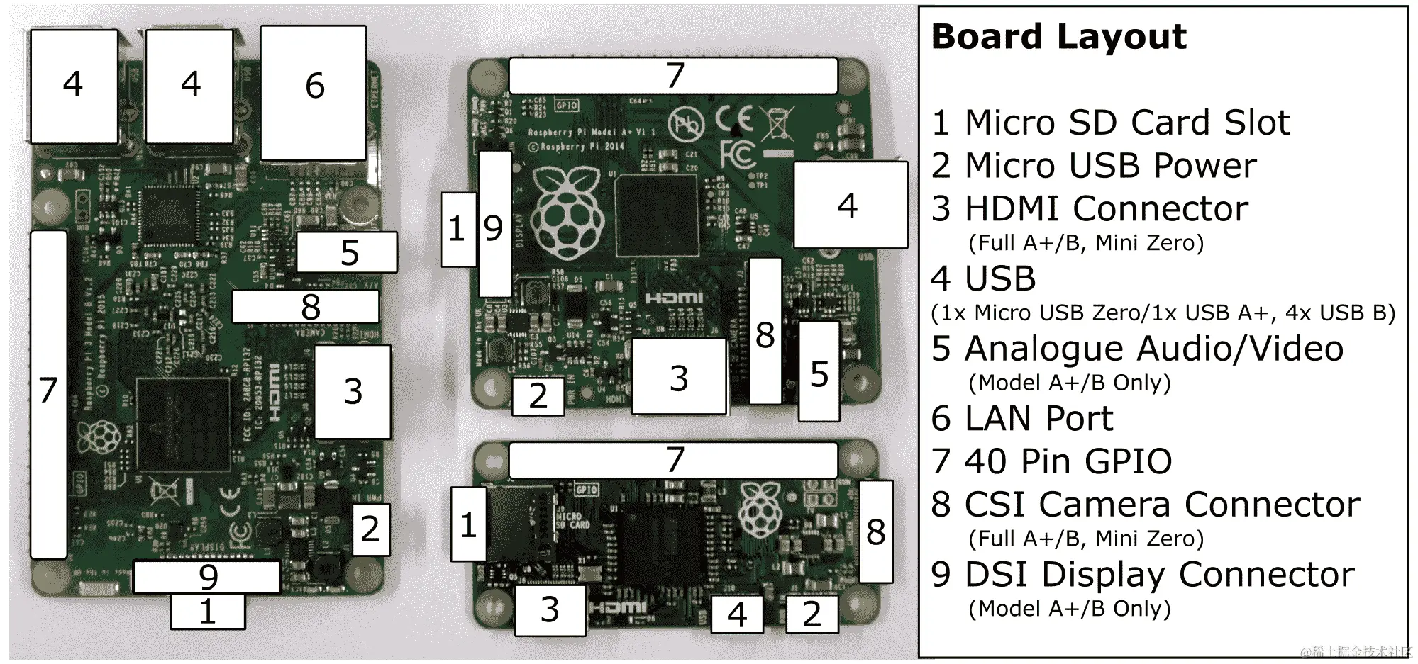 即使在 2012 年 2 月底发布计算机之前,树莓派已经在全球范围内获得了巨大的追随者,并且在撰写本书时已经销售了超过 1000 万台。以下图片显示了几种不同的树莓派型号: