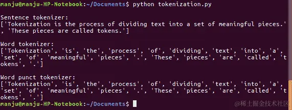 标记器得到的结果如下所示。它将一个句子分成单词组: