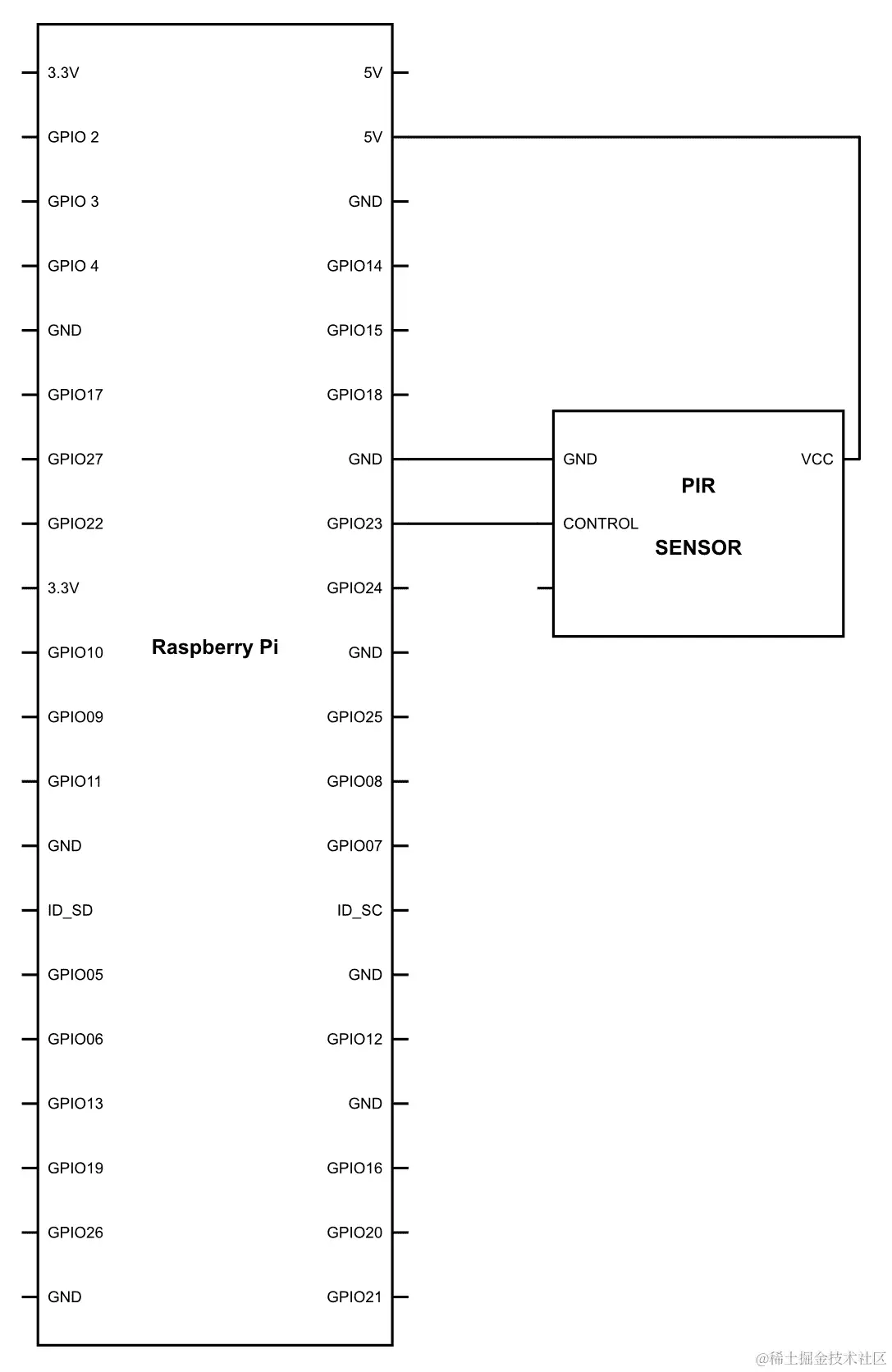 首先,按以下方式连接电路。在安装 PIR 传感器时,请确保它面向床,并检测其周围的任何运动。一旦 PIR 设置好,将传感器连接如下图所示,并看看会发生什么: