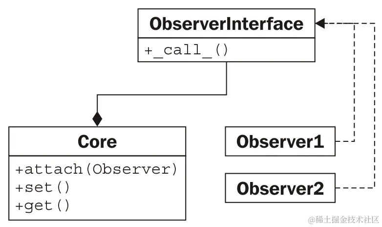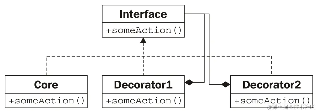 在这里,Core和所有的装饰器都实现了特定的接口。装饰器通过组合维护对接口的另一个实例的引用。当调用时,装饰器在调用其包装的接口之前或之后进行一些附加处理。被包装的对象可以是另一个装饰器,也可以是核心功能。虽然多个装饰器可以相互包装,但是所有这些装饰器中心的对象提供了核心功能。