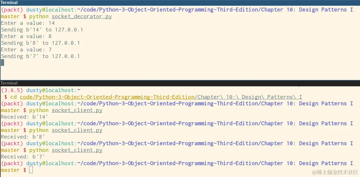 这个类装饰了一个socket对象,并向客户端 socket 呈现send和close接口。一个更好的装饰器还应该实现(可能定制)所有剩余的socket方法。它还应该正确地实现send的所有参数(实际上还接受一个可选的 flags 参数),但让我们保持我们的例子简单。每当在这个对象上调用send时,它都会在将数据发送到客户端之前将输出记录到屏幕上,使用原始 socket。