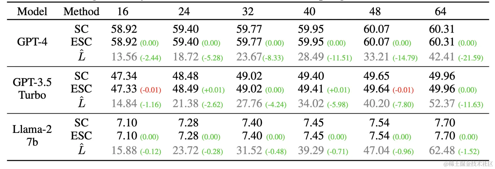 如表 1 和表 2 所示,一个明显的现象是成本节约与性能呈正相关。这是因为更佳的性能通常不需要更大的采样量。然而,ESC 不需要任何模型能力和任务难度的先验知识。
