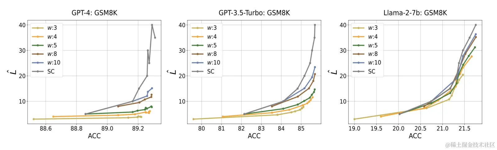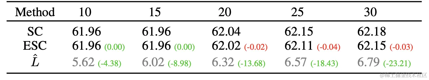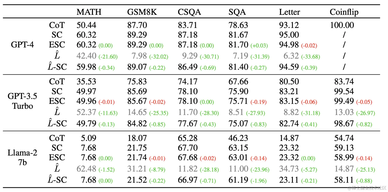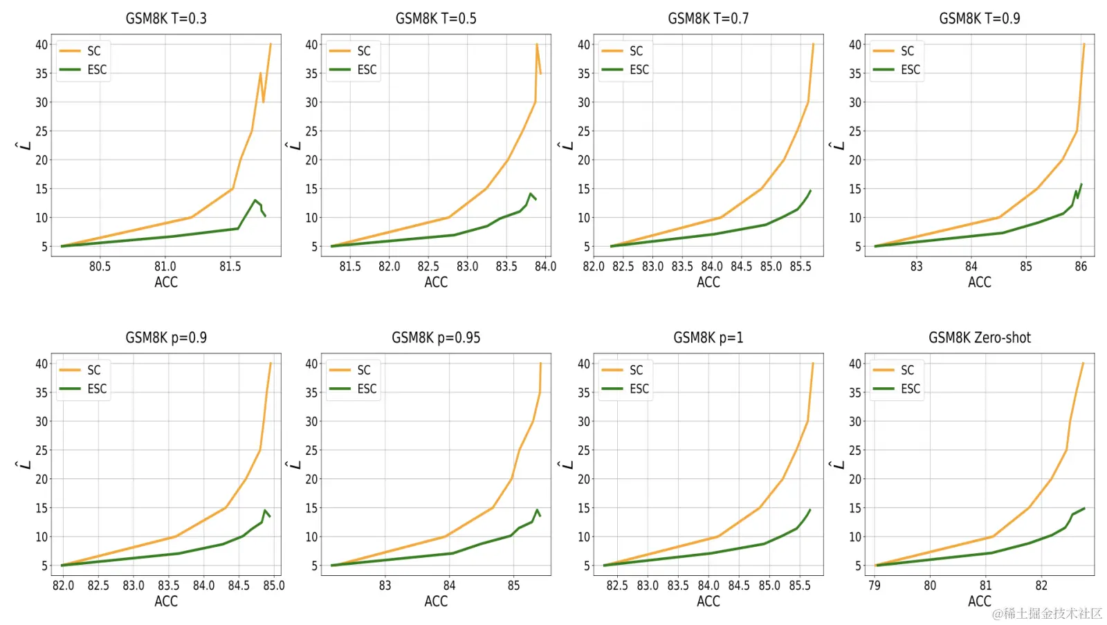 SC 显著优于 CoT,证实投票过程对推理的有效性。对于 ESC,L 远小于相应的最大采样大小,而性能几乎保持不变。我们还用 L 作为采样大小来测试 SC,其准确度大幅下降。总体而言,ESC 可以显著降低成本,同时几乎不会影响性能。在相同的采样成本下,ESC 可以获得更高的精度。