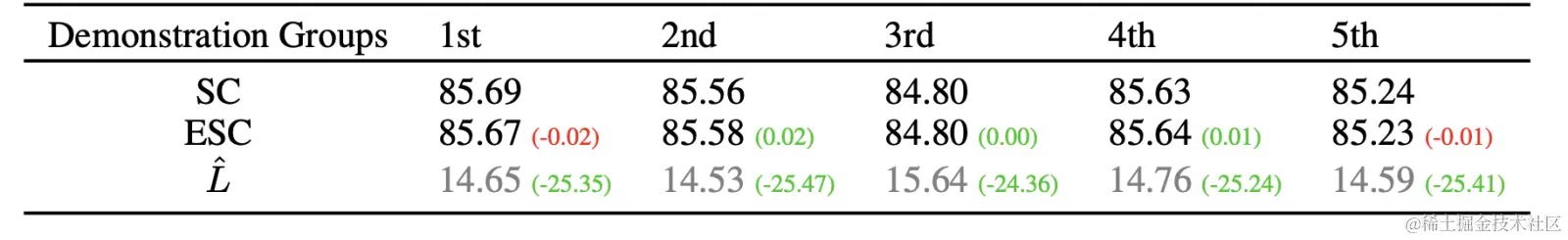 表 5 显示不同示例(demonstrations)组的 ESC 和 SC 的准确性,可以看到,ESC 对各种示例都是稳健的。