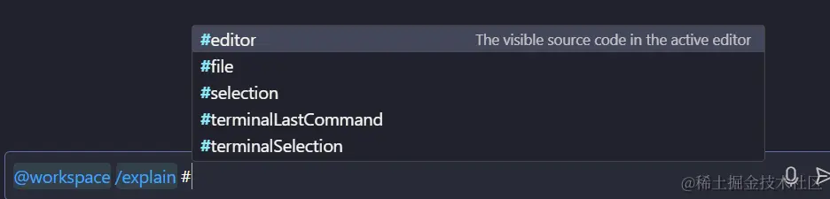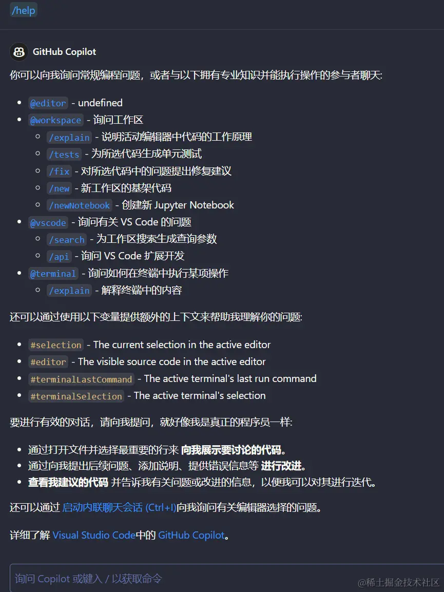 @workspace,可以解释选中的代码/explain,创建单元测试用例/tests、修复问题/fix、用脚手架创建新的项目/new、 写文档newNotebook