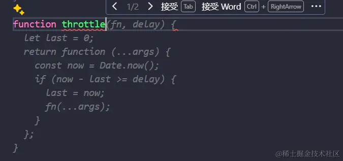 触发代码补全后,按下 Tab 接受会接受全部的代码