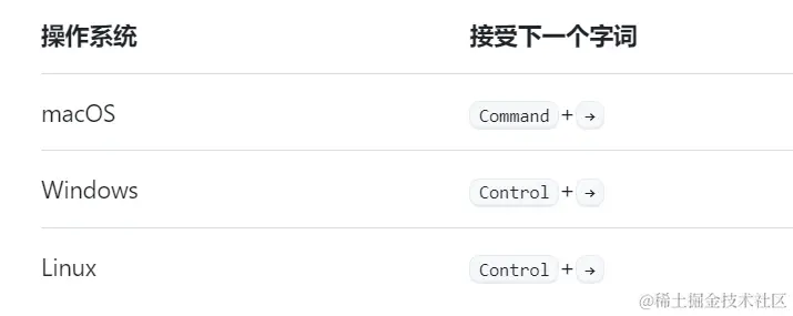 alt(option) +手动触发提示alt(option) + ]下一条建议alt(option) + [上一条建议ctrl(comand) + →一步步补全ctrl + enter十种代码实现ctrl(comand) + I行内操作Tab接受建议Esc拒绝建议