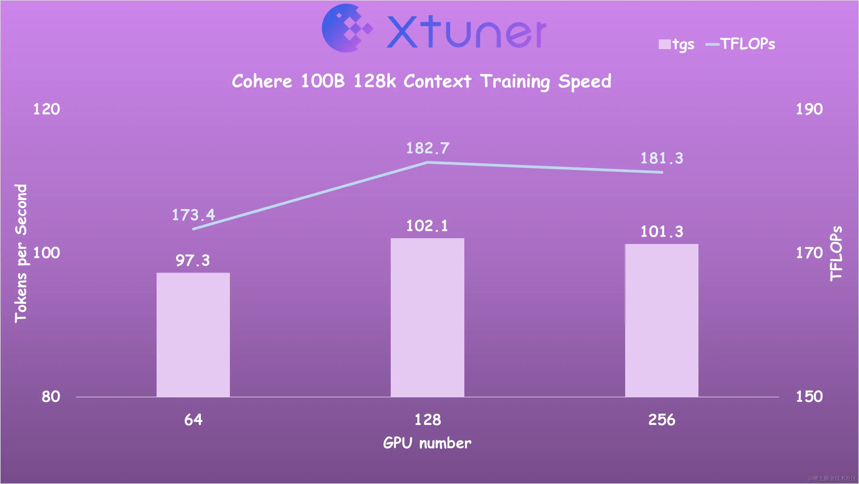 图 6 XTuner 训练 128k 上下文的 Command R+ 模型的训练效率