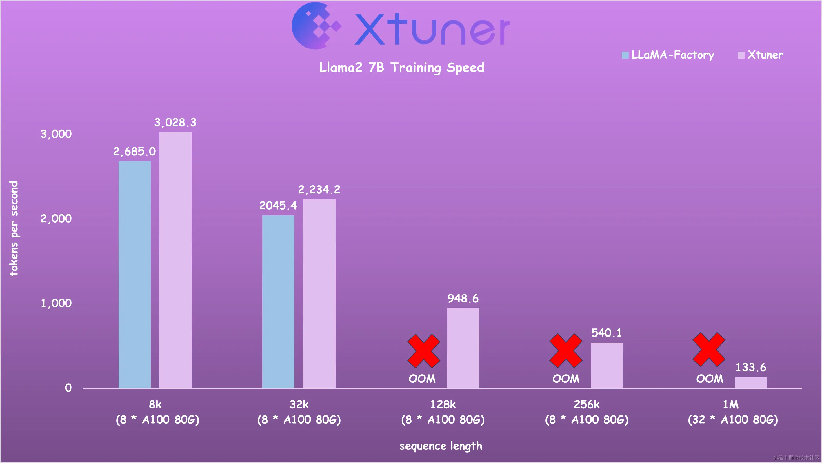 我们首先对比了 LLaMA-Factory 和 XTuner 在训练不同上下文长度的 Llama2-7B 模型时的训练效率。从图 4 的对比结果中可以看出: