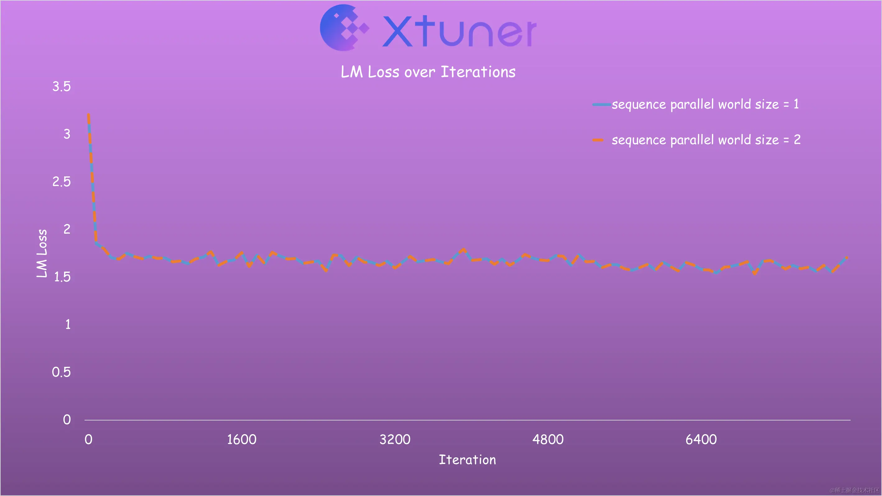 图 3 展示了在 RedPajama-Data-1T-Sample 数据集上训练 32k 上下文的 Llama2-7B ,在序列并行度设为 1 和 2 时的收敛性。XTuner 的序列并行是一种纯系统优化技术,用于实现超长序列的 Transformer 模型训练,而对于模型的训练精度上没有负面影响。