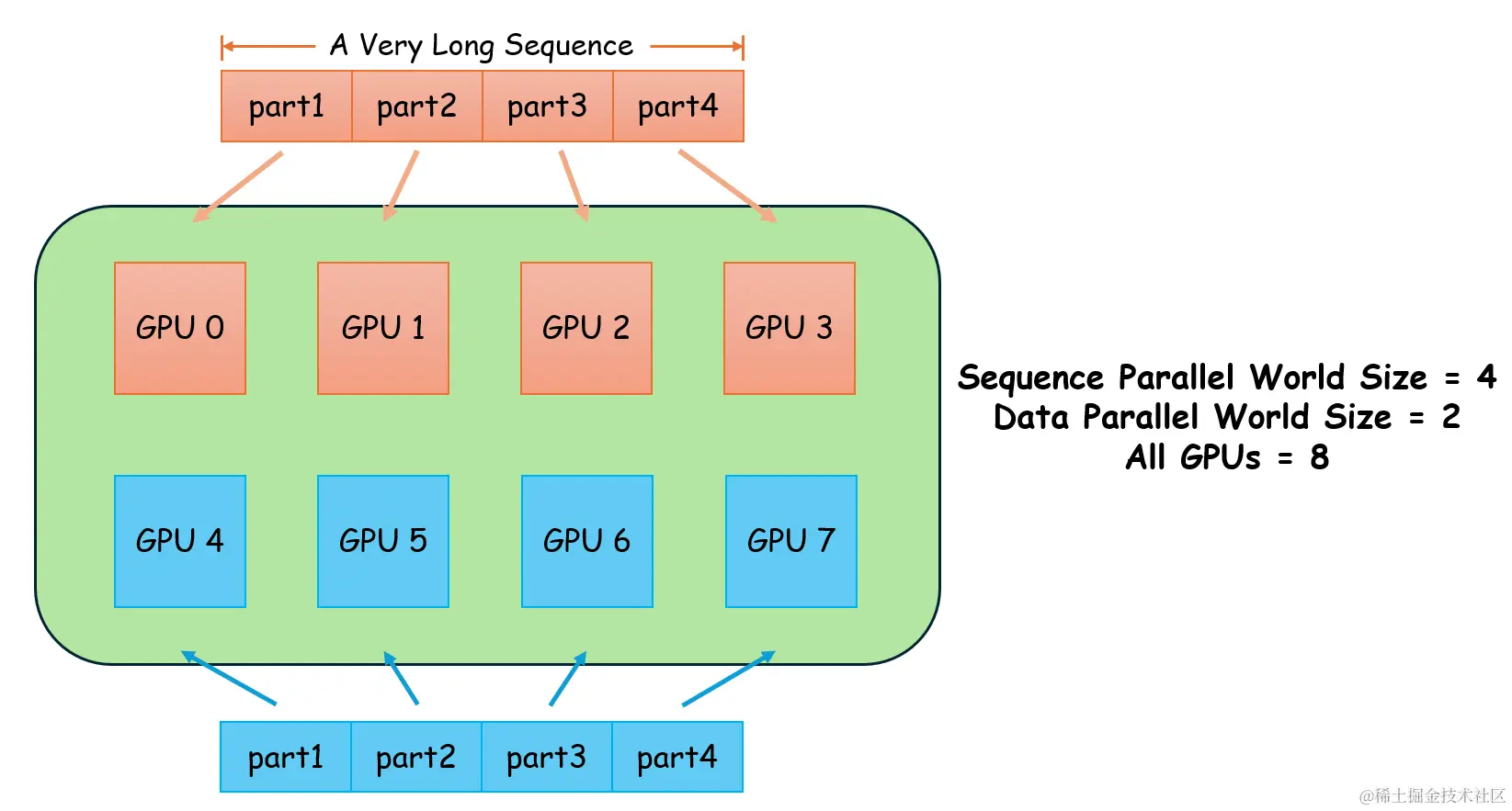 图 2 使用 8 块 GPU 进行分布式训练,序列并行度为 4 时的训练架构示意图