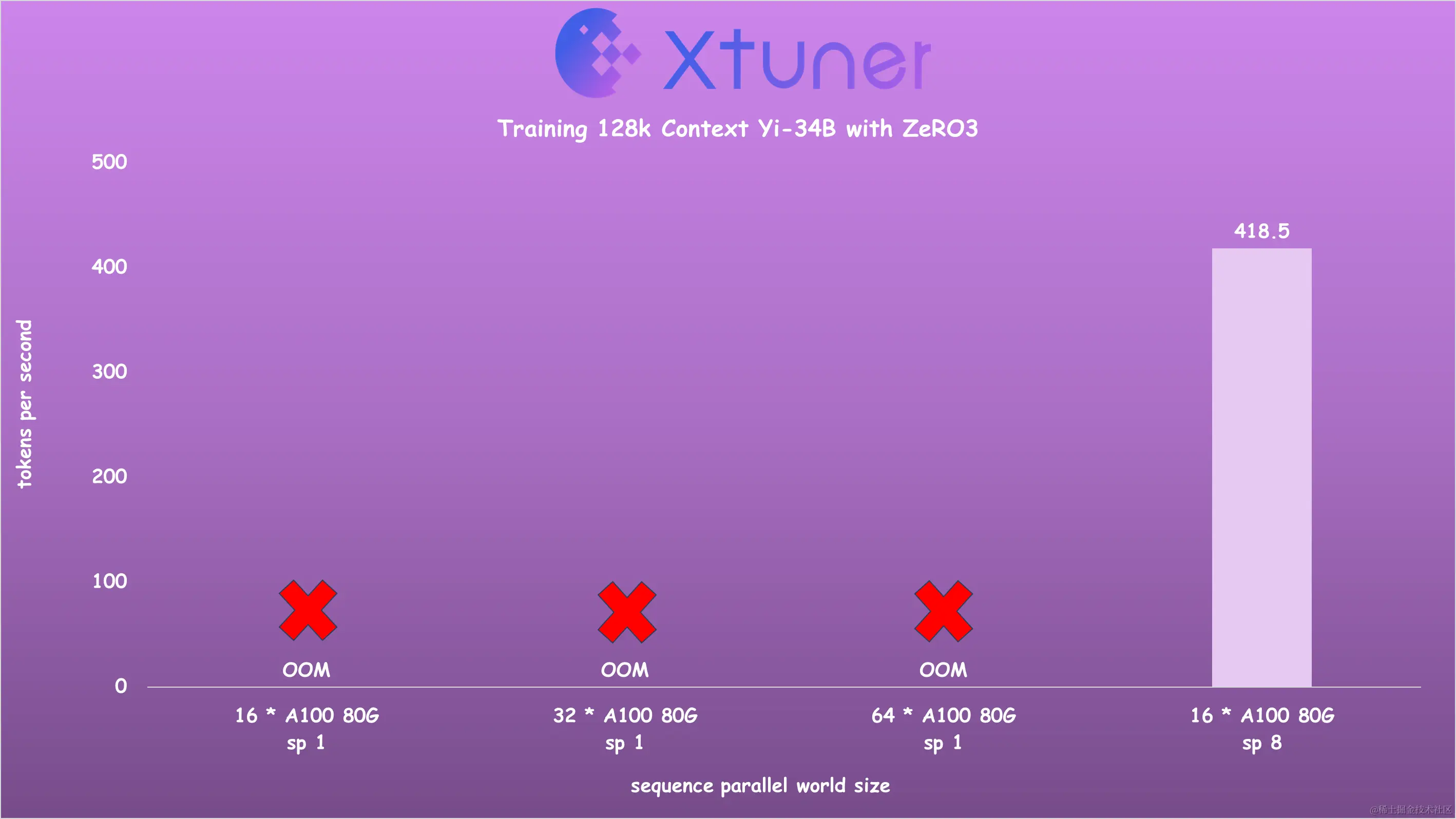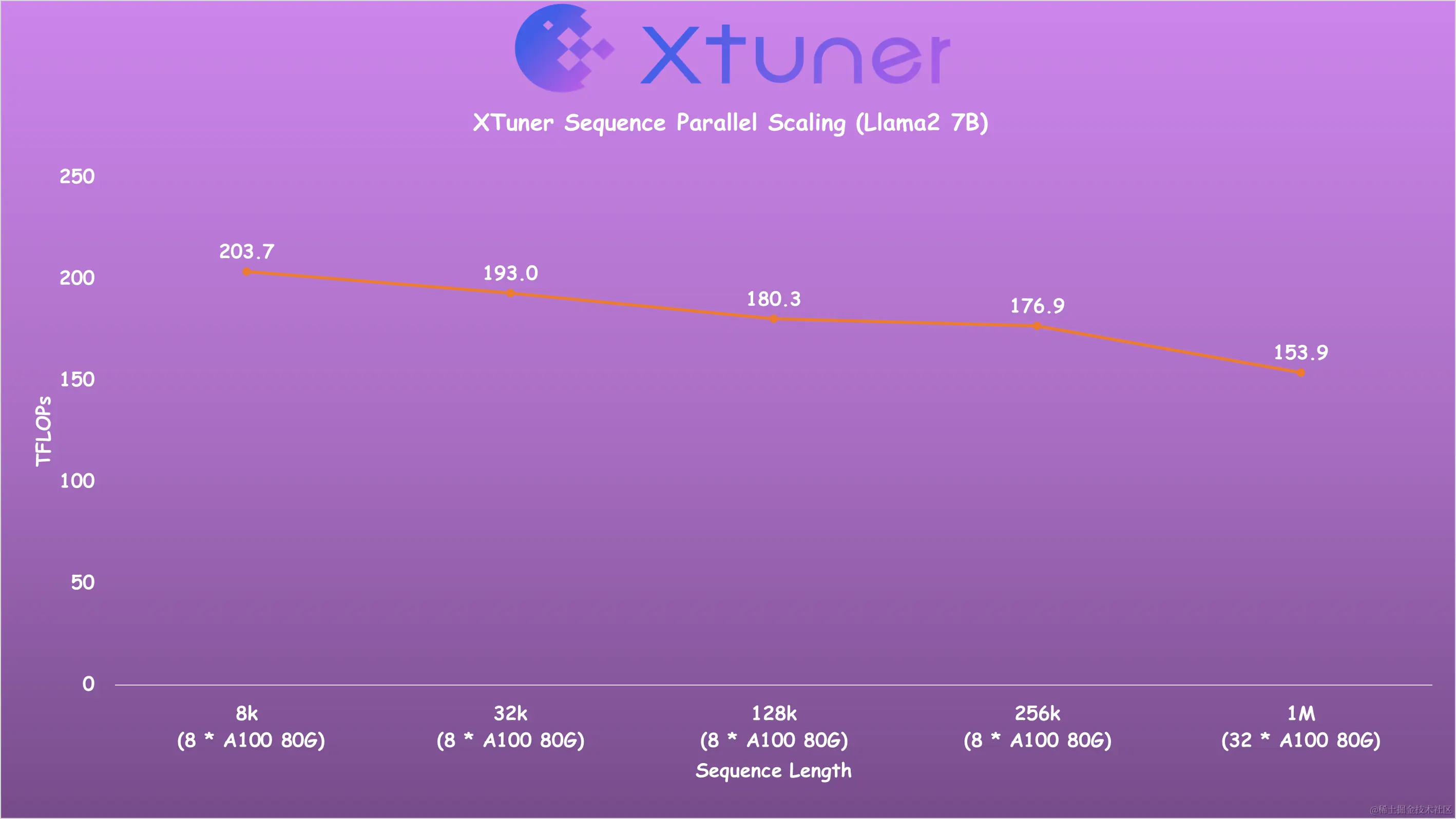 - 当序列长度逐渐变长时,Decoder Layer 中的激活值可能会占用大量的显存资源,进而导致 GPU out of memory。得益于序列并行策略,XTuner 可以将上下文长度提升至 1M (1048576) tokens。