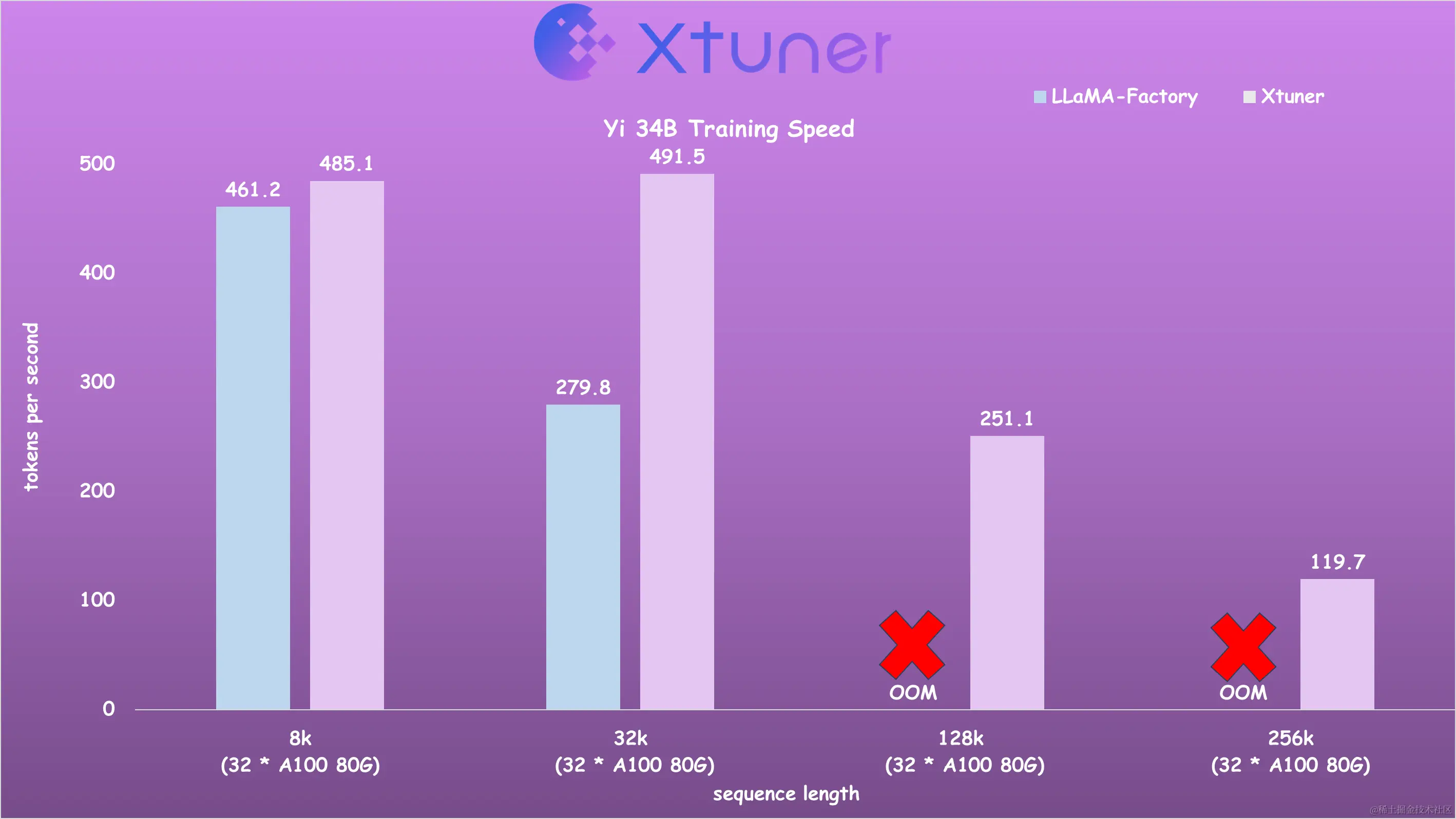 图 5 展示了 LLaMA-Factory 和 XTuner 在训练不同上下文长度的 Yi-34B 和 Llama2-70B 模型时的训练效率。从图中可知,序列并行策略对于大模型长序列序列是必要的。
