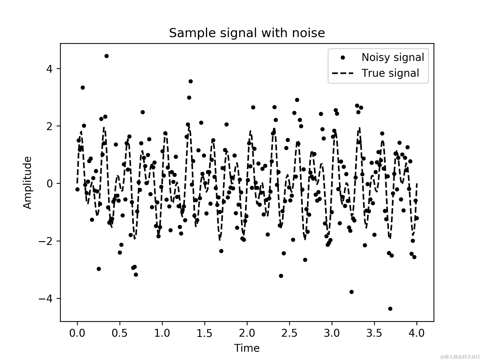 此处创建的图表显示在图 3.6中。正如我们所看到的,嘈杂信号与真实信号几乎没有相似之处(用虚线表示):