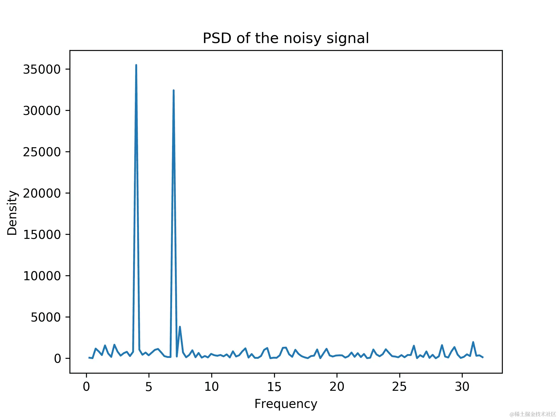 *我们将遵循使用 FFT 处理嘈杂信号的常见过程。第一步是应用 FFT 并使用数据计算信号的功率谱密度。然后我们识别峰值并滤除对信号贡献不足够大的频率。然后我们应用逆 FFT 来获得滤波后的信号。