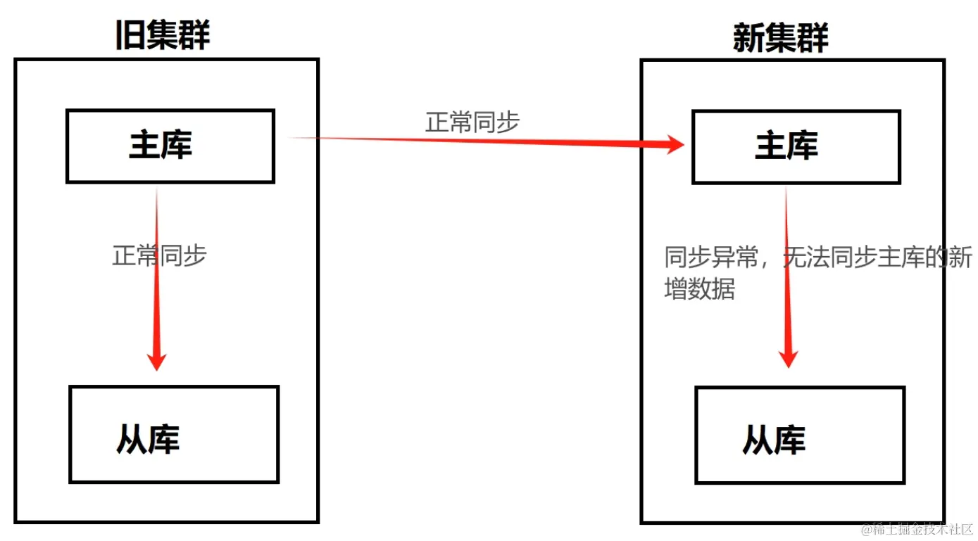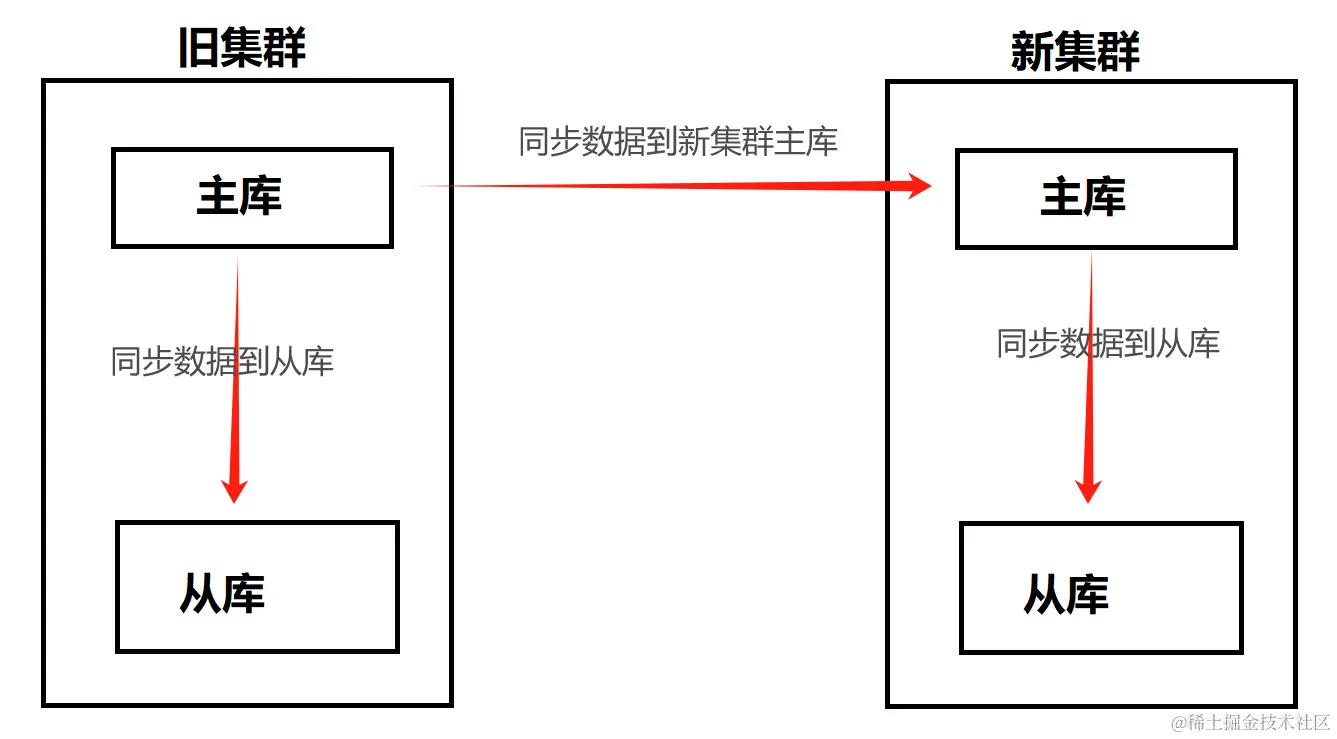 由此从 旧集群主库--->新集群主库--->新集群从库 之前形成了一条类似于链条式的同步关系,具体关系图如下: