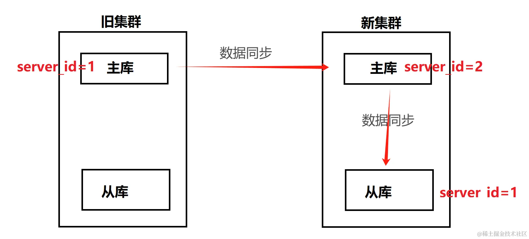 server_id为 1,新集群的主库的server_id为 2,新集群的从库的server_id为 1。这意味着什么?旧集群主库的